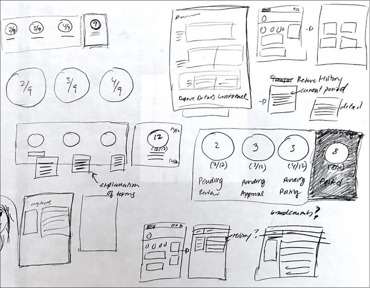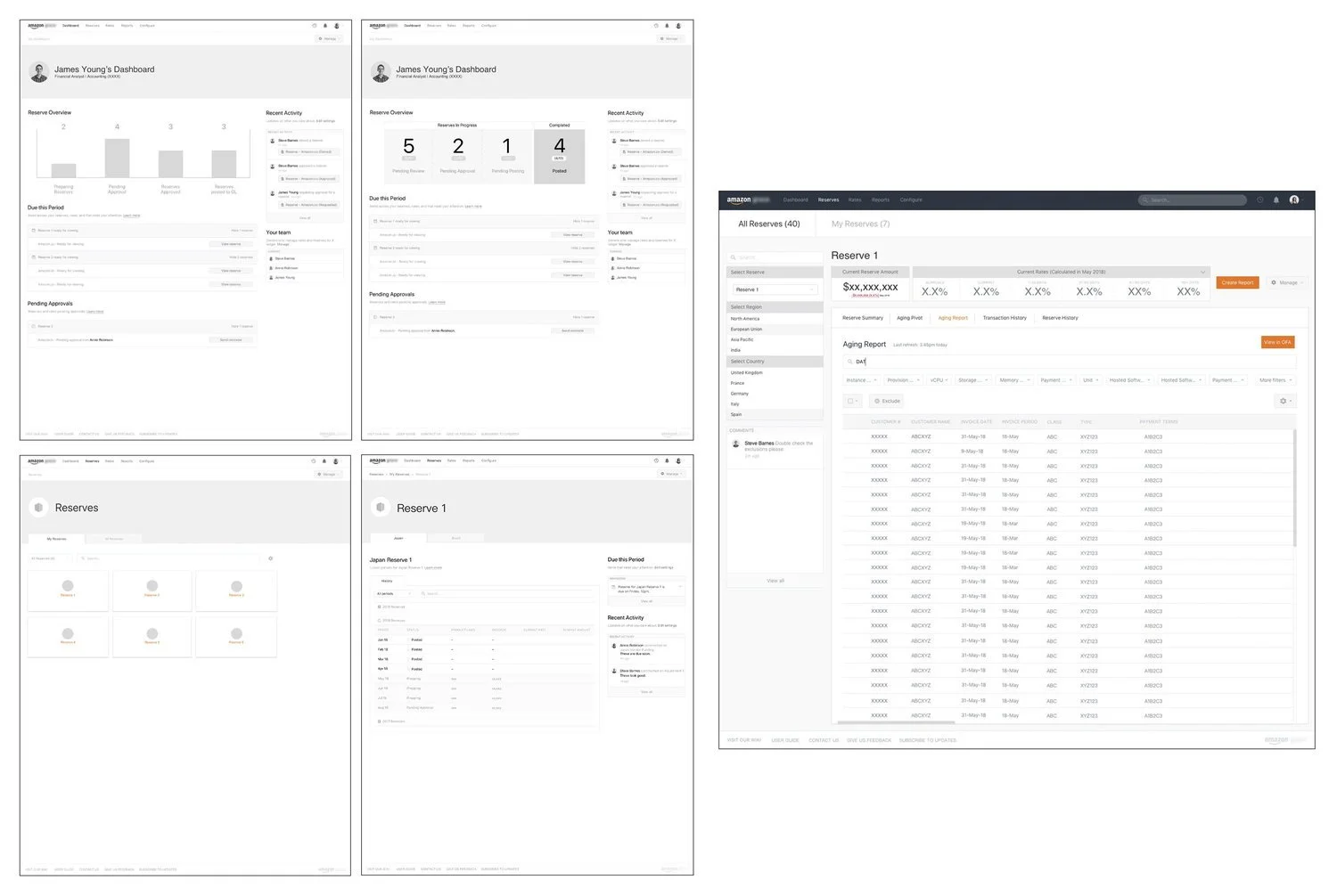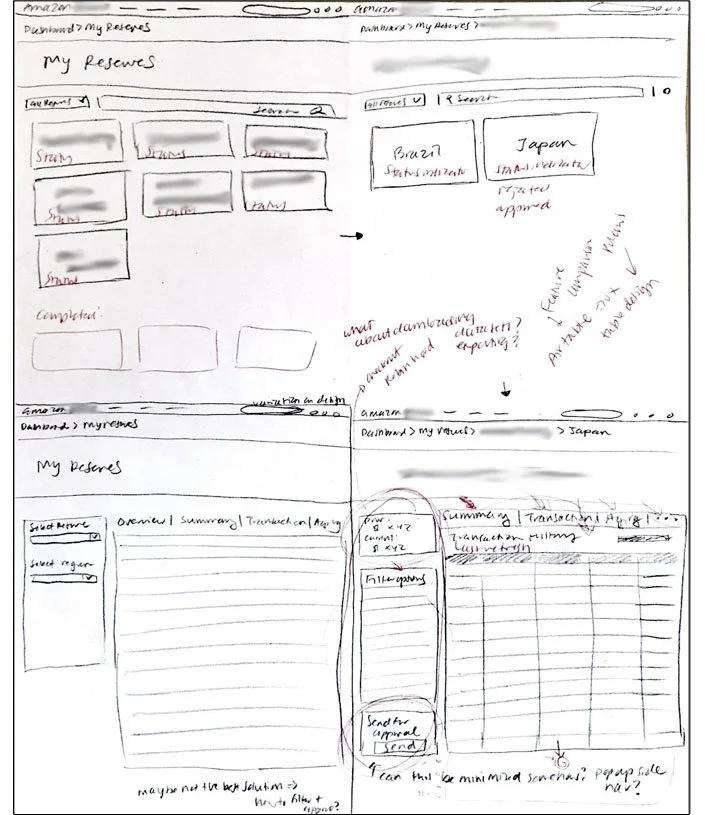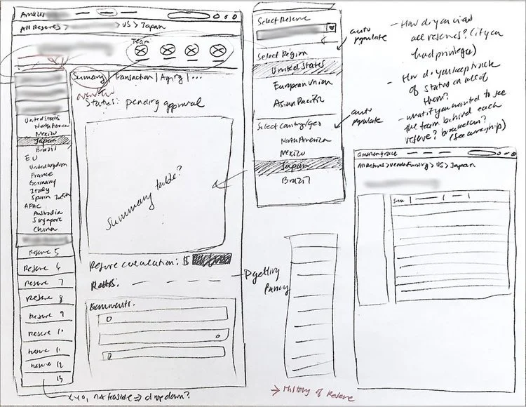 After understanding what the new finance tool can do to improve on accountant’s processes, I started sketching different wireframes for what the interface would look like. Below is a series of sketches I created imagining what key screens would look like, such as the Dashboard and the Reserve screens.