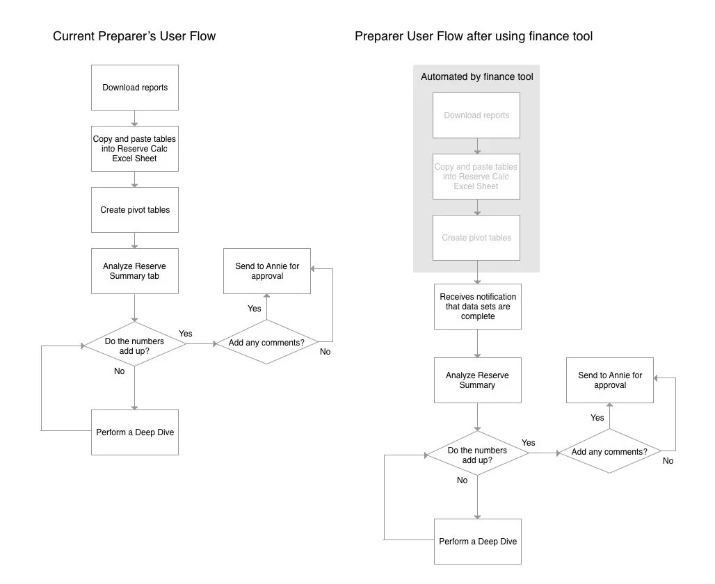 In particular, this is a pair of user flows that studies the Preparer’s decision-making process. The user flow on the left reflects decisions when using the manual Excel sheets to calculate reserves. On the right, is the same Preparer’s flow but with the finance tool automating the first three steps. Having the first 3 steps automated frees the user to spend more time analyzing the numbers, rather than wasting time doing the pre-calculations.